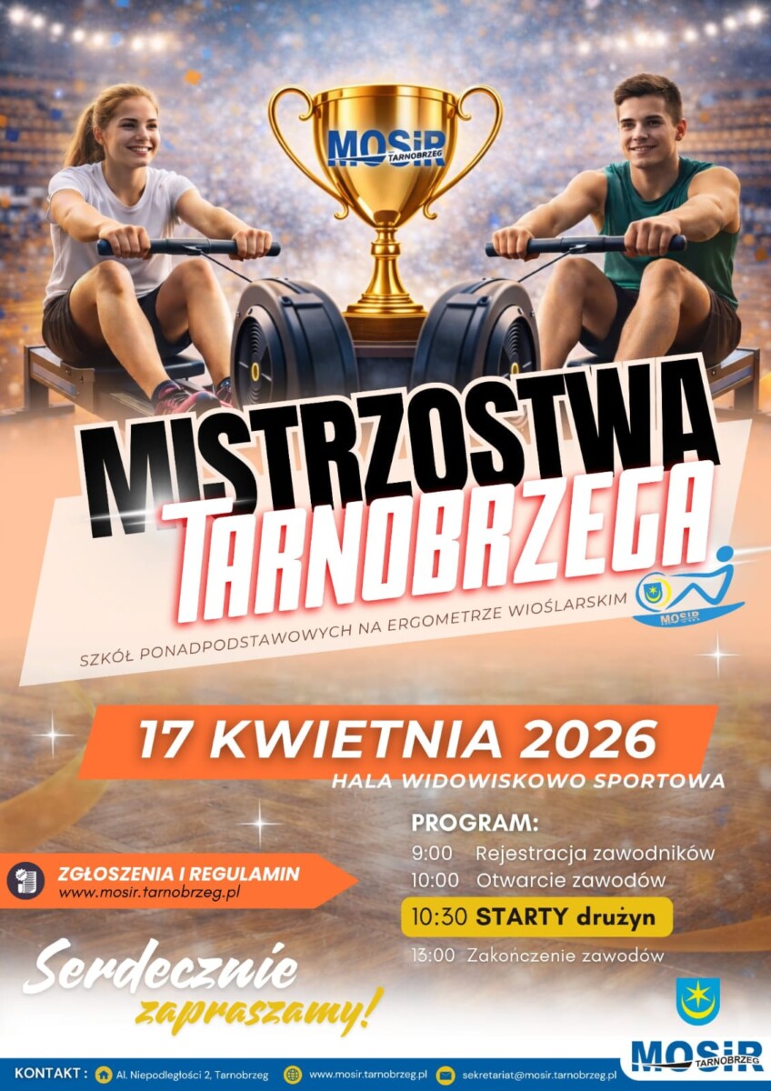 W dniu 17 kwietnia 2026 roku w Hali Widowiskowo-Sportowej MOSiR Tarnobrzeg odbędą się Mistrzostwa Tarnobrzega Szkół Ponadpodstawowych na Ergometrach Wioślarskich.