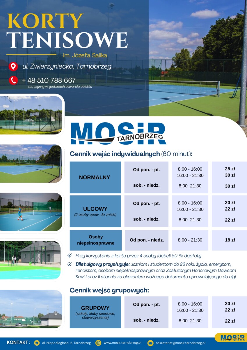 *Informujemy, że Kompleks Kortów Tenisowych „Zwierzyniec” im. Józefa Salika będzie otwarty do 31 października. Dni otwarcia kortów uzależnione będą od warunków atmosferycznych.