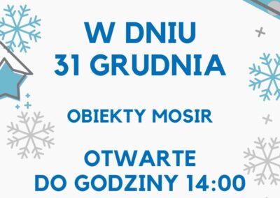 Informujemy, że w Sylwestra 31 grudnia (wtorek) obiekty Miejskiego Ośrodka Sportu i Rekreacji będą czynne do godziny 14:00.