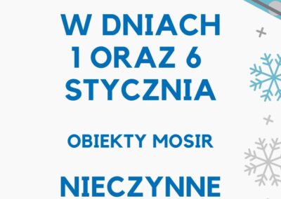 W dniach 1 stycznia (środa) oraz 6 stycznia (poniedziałek) 2025 roku obiekty będą zamknięte.